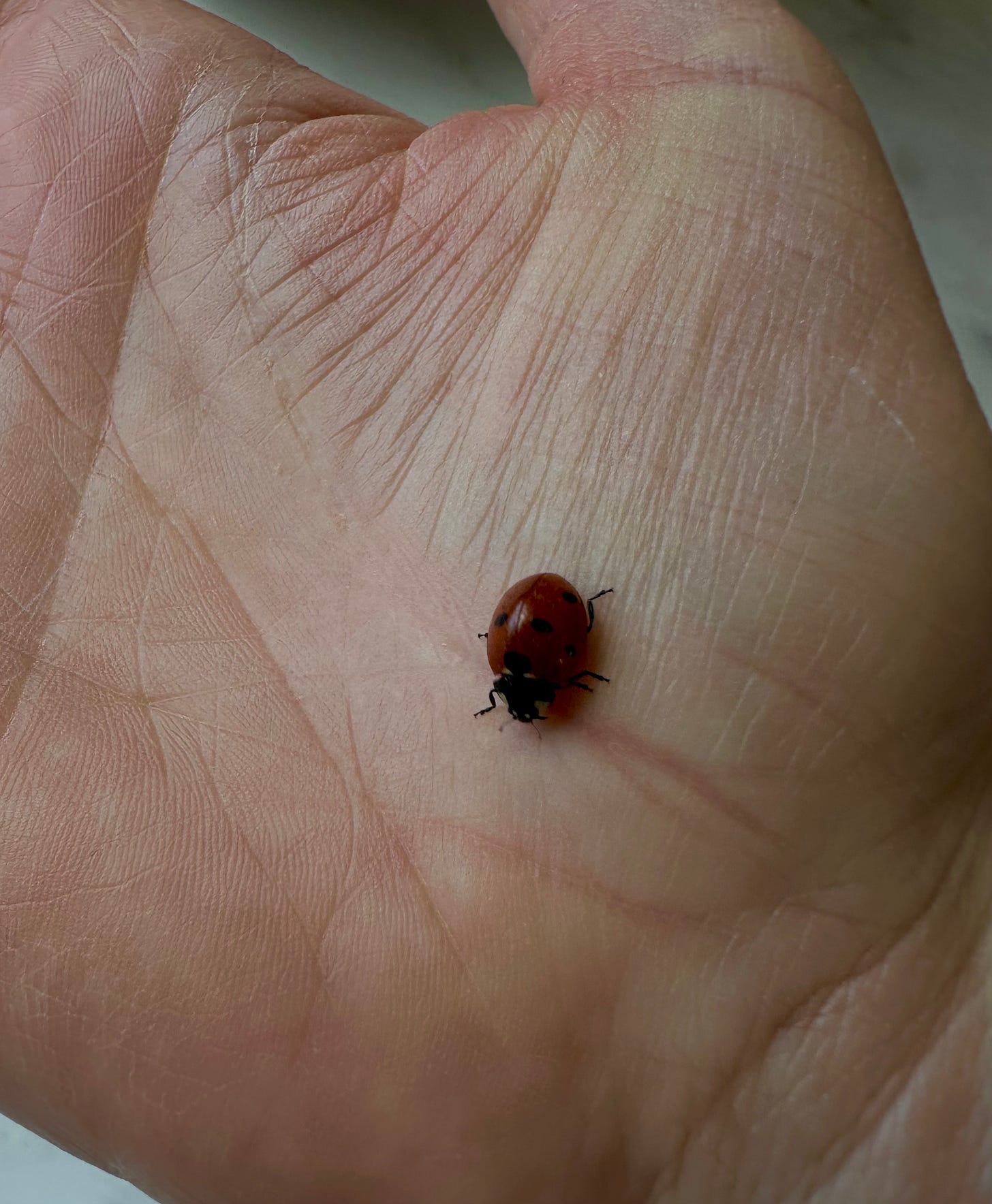 As I write this, though, I panic and realize I have no idea how long ladybugs actually live. I'm horrified she might never again get to feel the warmth of the sun on her back or taste the sweetness of aphids. My chest is tight; I'm responsible for her now. Her fragile existence suddenly mirrors my own vulnerability—both of us sheltering from different storms.