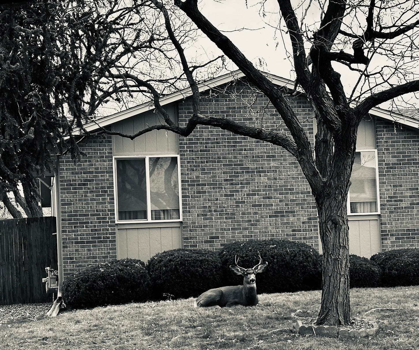A young stag has taken up residence in my neighbor’s front yard. I’ve seen him there, his legs tucked beneath him like a house cat, watching the world pass with dark, velvet eyes that seem to hold centuries of knowing. Cars pass, dogs bark, squirrels run along, yet he remains, unperturbed, as if he has discovered some profound secret about stillness that we’ve forgotten in our human hurrying. He sits there for hours, this wild creature choosing meditation in the midst of our neighborhood, teaching us that sometimes the most radical act is simply to be still, to witness without needing to participate.