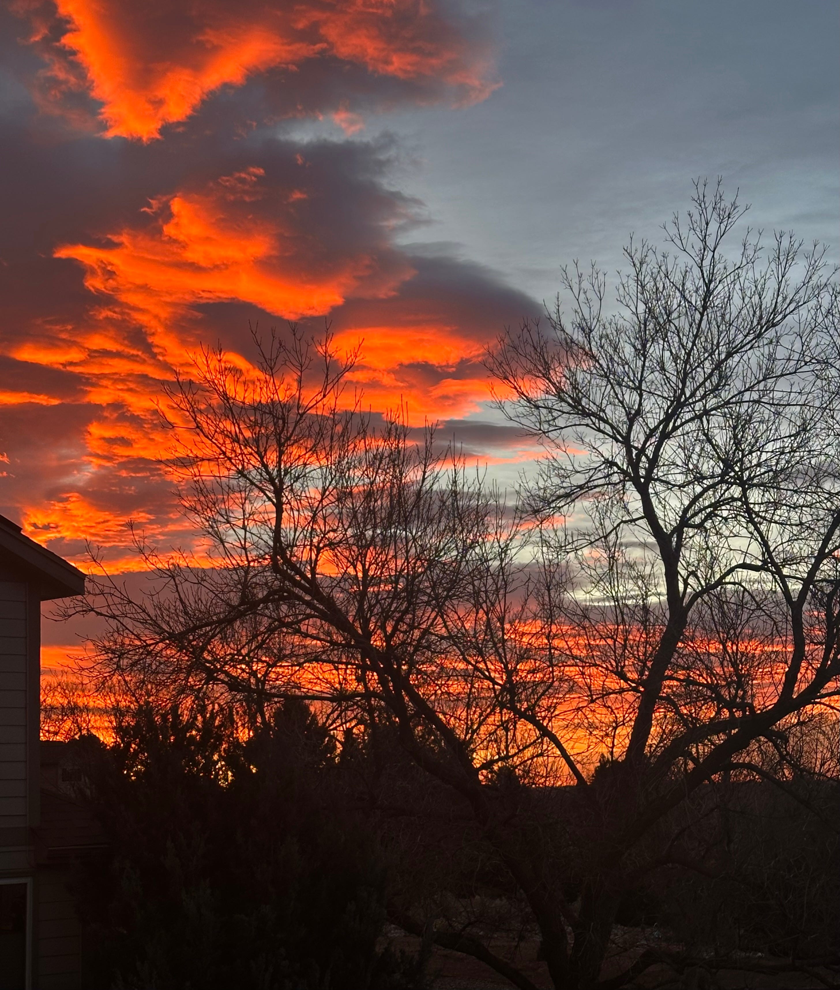 This morning it broke across the sky in fire red, everything burnished. Light reflected bright pink in my dear neighbor’s windows, their house suddenly glowing like a lantern. To the west the foothills turned copper, the bare branches of the trees lit like filaments. It took my breath.